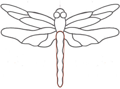 See that long notched body piece in the bottom center of the dragonfly in the pattern below? Most people try to follow the curves with their cutter which inevitably ends up leaving them with an unsymmetrical body. The trick is to cut it straight along the widest points of the body. In other words, follow the red line I've drawn along the body.