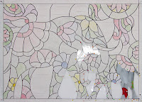 We need a name for this pattern and I've decided to call it the Tulips of Life in an obvious reference to Frank Lloyd Wright's Tree Of Life design which is very similar. At any rate, Linda F began grinding her window and you can tell by the amount of pins (as well as their placement) that she's ready to start foiling. I love that she added color to this design which we've seen done many times but only ever in assorted clear glass textures. She's made it hers!