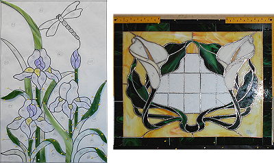 Ok, I feel like such a heal about this next window. After starting off the last blog entry explaining how I sometimes misattribute windows to the wrong students I ended up doing far worse last week. I completely skipped our newest student, Paula's Iris Window! The picture on the left is what you should have seen last week. Paula had all of the Iris portion of her window cut out and did a wonderful job with it. When she returned this week she began cutting all of her clear background pieces. I had steered her wrong the week before by recommending a light green for the leave flips but the contrast was far too great (as you can see in the first picture) so I recommend that we change it. And that we did. Paula now has two similar greens for her leaves but when they light up you'll see a color difference to denote the back side of the leaf. Paula has already begun grinding her window and will certainly begin wrapping it during her next class.