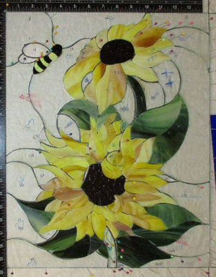 Tracey's Magnolia is another round window that's being worked on-- one of three in fact. She has just a few more pieces of the leaves left to go and then a small amount background glass which I'm sure will be accomplished upon her return. After that she'll move along to the grinder.