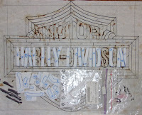 Cheryl is feeling VERY adventurous because this week we got to see her begin a very detailed Harley-Davidson Window. There's a lot to line up here but Cheryl is going to take things one section at a time. She's started things off by cutting out the letters for the words HARLEY DAVIDSON and when she returns she'll cut out the background glass for those letters. Once they've been ground and wrapped in foil she will tack that section together and then wash all of the flux off of that section before moving on to either the MOTOR or the CYCLES word section.